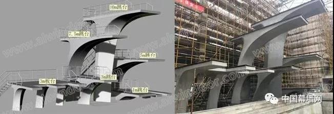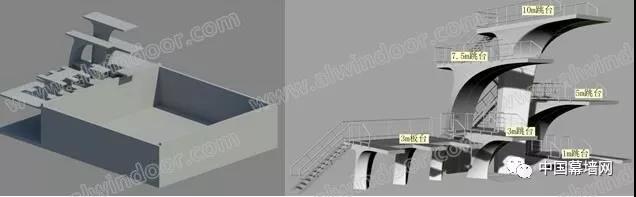 寧波奧體中心游泳館跳水池擁有9個跳臺,其中包括2個1m跳臺,3個2.6m板臺,1個3m跳臺,1個5m跳臺,1個7.5m跳臺以及1個10m跳臺。其中跳臺為空間多曲面清水混凝土空腔結構,空間感強,成型要求高,施工難度大。