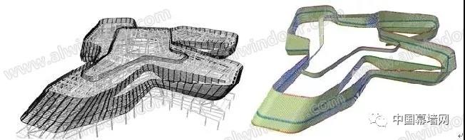 在空間異型項目中,傳統的二維軟件已經無法滿足此類項目的設計,加工,定位,安裝等要求,通過BIM技術的介入,實現三維可視化建模,指導設計出圖。并且在設計階段進行合理優化,有效降低材料加工以及施工難度,縮短施工周期,節約材料以及施工成本。尤其是異型雙曲玻璃幕墻,由于玻璃材質本身特性,給加工施工帶來很大難度,雙曲玻璃板塊加工成本高昂,成品率低,加工精度誤差大,運輸,安裝成本高。并且與板塊相關的所有鋁合金輔材都需要特殊加工。綜合上述所有因素,在雙曲幕墻設計階段就需要對幕墻進行合理優化,降低施工難度,節約材料成本,縮短施工周期,提高施工質量。寧波北侖中國港口博物館A穹頂,該穹頂面積1411㎡。包含雙曲面板415塊,796㎡;單曲面板162塊,615㎡。對原模型進行翹曲只分析,控制翹曲值范圍,通過平面擬合雙曲面的方式有效降低加工施工難度,節約材料成本與施工成本。