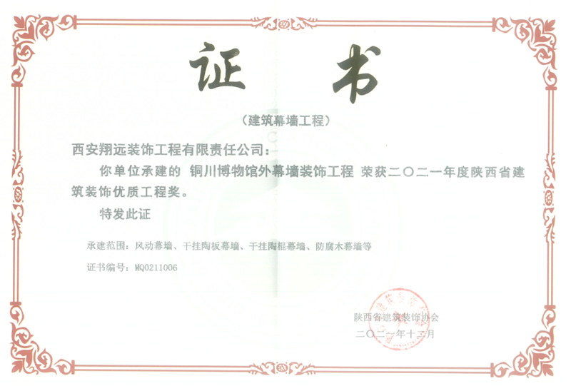我司設計承建的銅川博物館外幕墻裝飾工程榮獲“陜西省建筑裝飾優(yōu)質工程獎”。