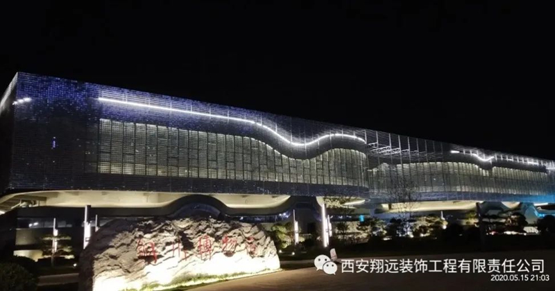 我司承建的銅川博物館是目前我國西北僅有、國內最大的風動幕墻建筑。該項目主要由風動幕墻,藝術混凝土干掛板、噴涂板,干掛陶板、異形陶棍,插芯陶磚,干掛瓷板,實木外墻板,金屬板,光伏發(fā)電幕墻,不銹鋼等等四十余種外幕墻材料筑造而成。當清風徐來,風動幕墻如水波微動,以流動的曲線寓意山水銅川。