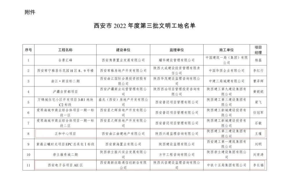 祝賀我司 參與施工的正和中心項目、西安電子谷AE區項目獲得西安市2022年度第三期“文明工地”稱號。