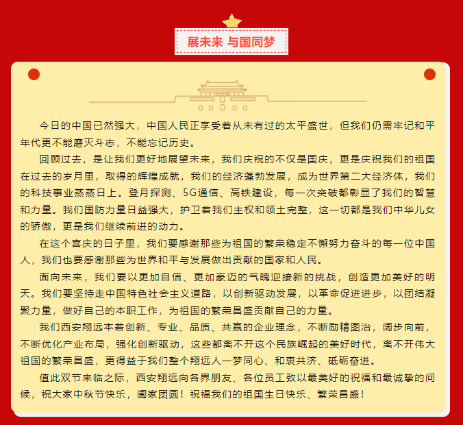 慶盛世華誕,迎金秋滿月,西安翔遠祝全國人民中秋佳節(jié)闔家團圓!祝福偉大的祖國生日快樂、繁榮昌盛!