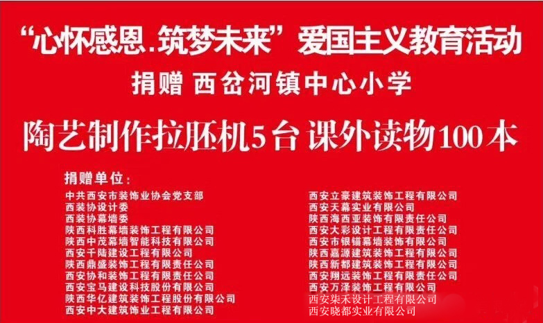“情系山區學子,心懷感恩,筑夢未來”!2018年4月21日至22日,由中共西安市裝飾業協會黨支部、西安市裝飾業協會設計專業委員會、西安市裝飾業協會幕墻門窗專業委員會發起的愛心倡議,匯同二十多家捐助企業及愛心人士,對漢中市佛坪縣西岔河鎮中心小學進行捐助。