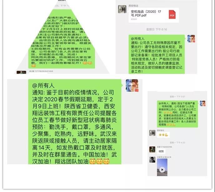 疫情就是命令、防控就是責任。此次疫情突發(fā)于我國新春佳節(jié)期間,為支持國家大目標,積極響應政府疫情防控工作要求,執(zhí)行“政府不發(fā)話,我們不復工”,我司多次下發(fā)延期復工通知的同時做好企業(yè)內部防控措施,從國外購買防護口罩、紅外測溫儀等防護用品。我們堅信,做好企業(yè)自身防疫管理,不給國家添麻煩就是做貢獻,為此: