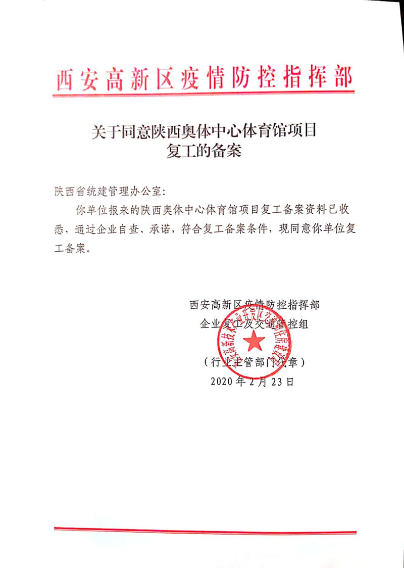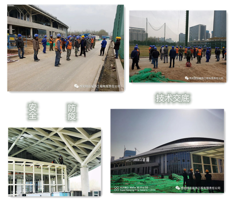 疫情期間,為確保陜西奧體中心體育館順利按期交付使用,我司在項(xiàng)目申請(qǐng)復(fù)工批準(zhǔn)后,迅速組織落實(shí)勞務(wù)班組、材料、機(jī)械、設(shè)備等,項(xiàng)目管理人員于2020年2月24日到達(dá)現(xiàn)場(chǎng),多措施組織勞務(wù)施工人員準(zhǔn)時(shí)到達(dá)施工現(xiàn)場(chǎng),多方協(xié)調(diào)材料供貨廠家、加工廠,確保材料及時(shí)供應(yīng)和現(xiàn)場(chǎng)施工有序進(jìn)行,并采購充足防疫物資,確保現(xiàn)場(chǎng)防護(hù)及施工安全。