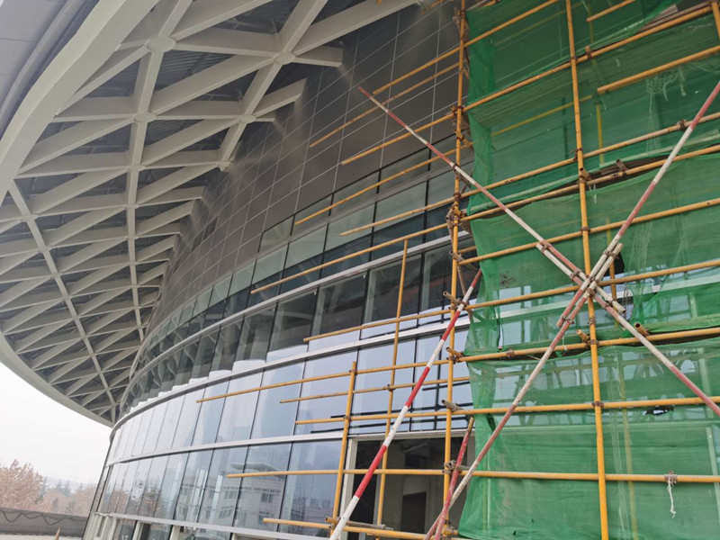 陜西奧體中心體育館為省級(jí)重點(diǎn)項(xiàng)目,質(zhì)量要求為“魯班獎(jiǎng)”。我司參與承建陜西奧體中心體育館項(xiàng)目外幕墻工程,幕墻面積約17000平方米。包括半隱框玻璃幕墻、隱框幕墻、鋁板幕墻、電動(dòng)開窗、車道雨棚等子項(xiàng)。建筑多為曲面,定位復(fù)雜,幕墻立面與球形屋面交接部位高低起伏大且非規(guī)則形狀;屋面網(wǎng)架結(jié)構(gòu)跨度較大,風(fēng)壓作用變形對(duì)立面幕墻影響大;曲線形狀且平面尺度大、收邊收口多。